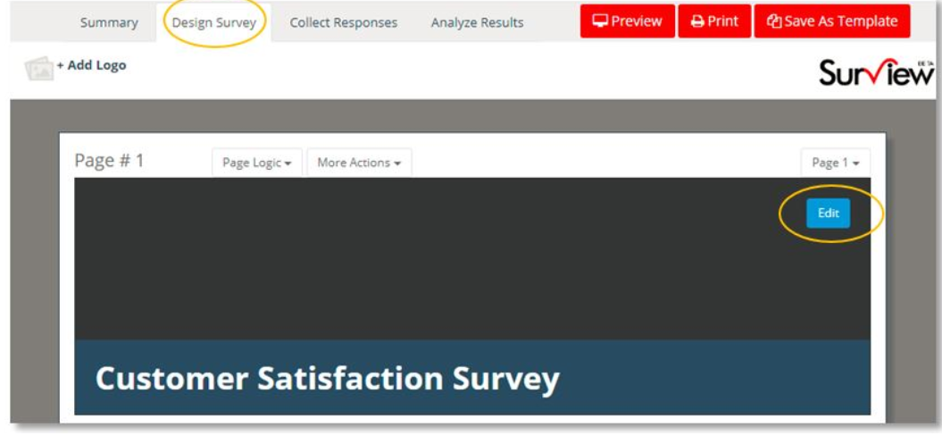 On the Design Survey page, click the Edit button in the upper left corner of the page.