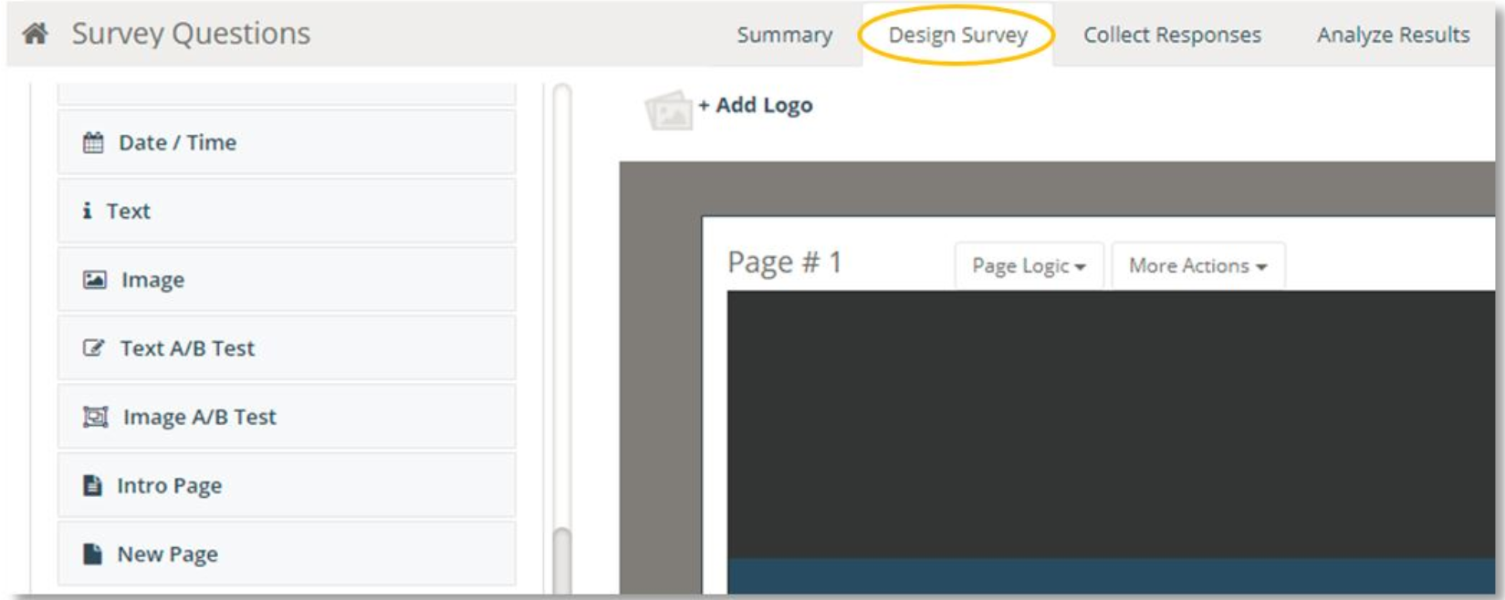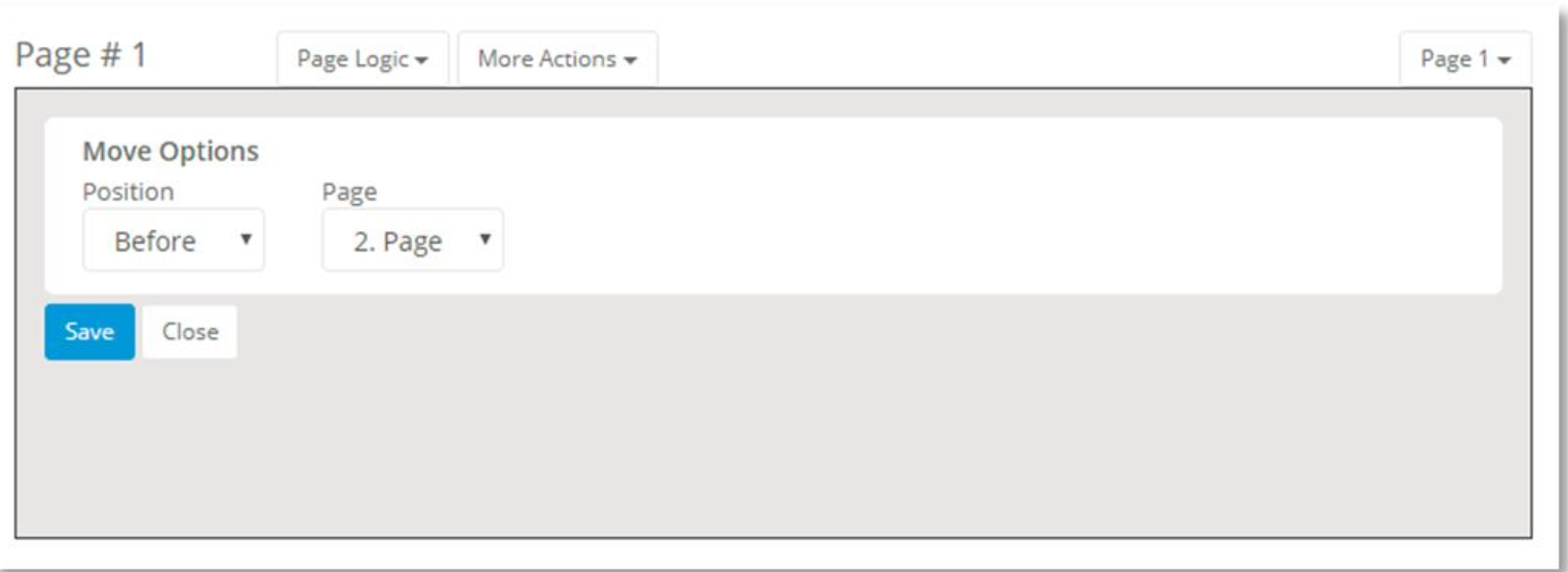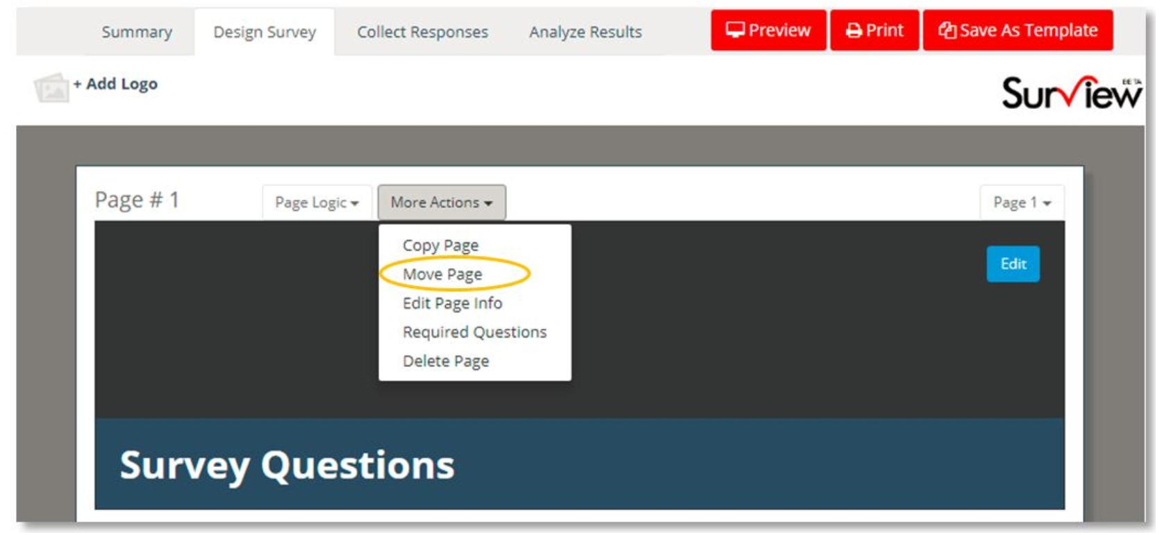- On the Design Survey page, scroll to the page which you’d like to move to a new position.