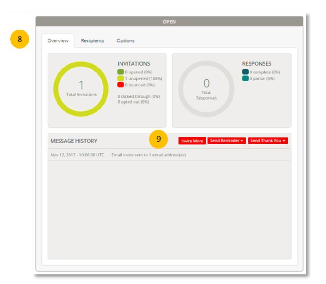 - System will show overview of the email collector’s activity which will include numbers for email invitations sent; opened / unopened emails; bounced emails.