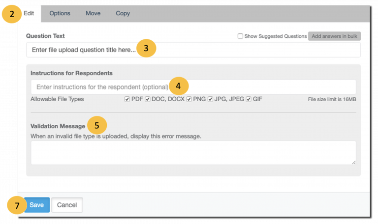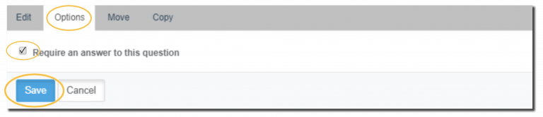 Under the Options, Move and Copy tabs, you can make an additional customization to your survey questions in the following ways: