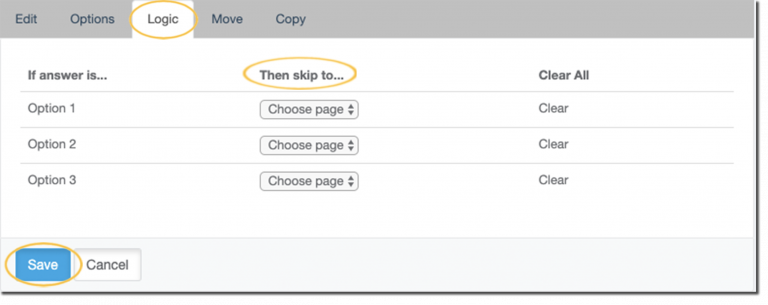 - Logic – includes an option that moves respondents to a different question or page on the basis of their response to the current question. To enable skip logic, click here.