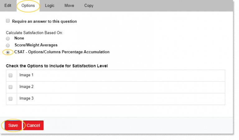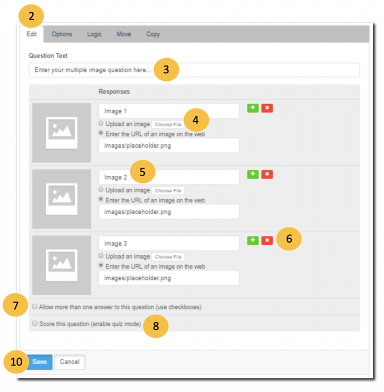 Under the Edit, Logic, Options, Move and Copy tabs, you can make additional customization to your survey questions in the following ways: