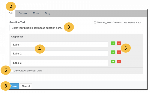 The Multiple Textboxes question allows you to collect multiple open-ended answers with a single question. You can also configure this question to collect numerical data only.