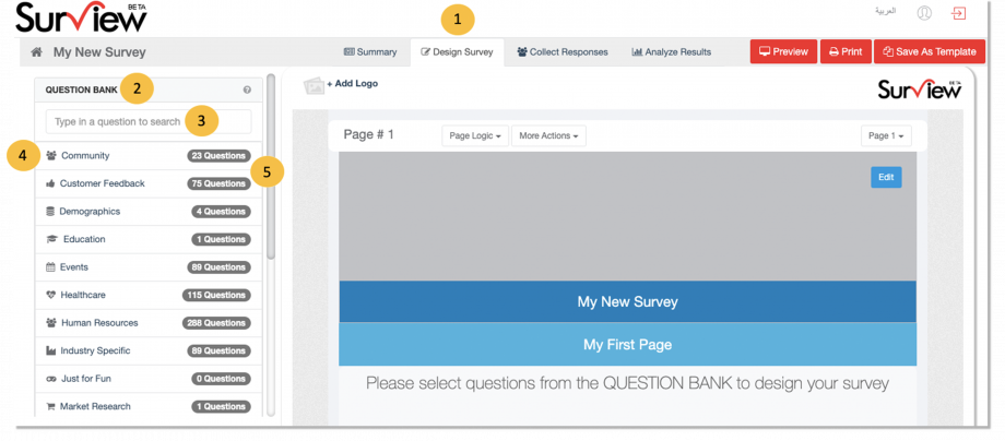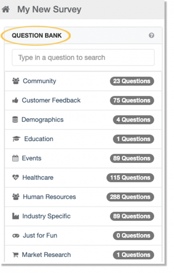 Another way to add questions is through the QUESTION BANK. It is a library containing over 10 categories with hundreds of ready-made questions that you can use to your survey. This feature is available to all Surview customers. All you have to do is to create a Surview account and design a survey to test run with it.