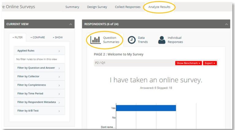 When you click the Analyze Results tab, Question Summaries tab will show by default. Here you can view: