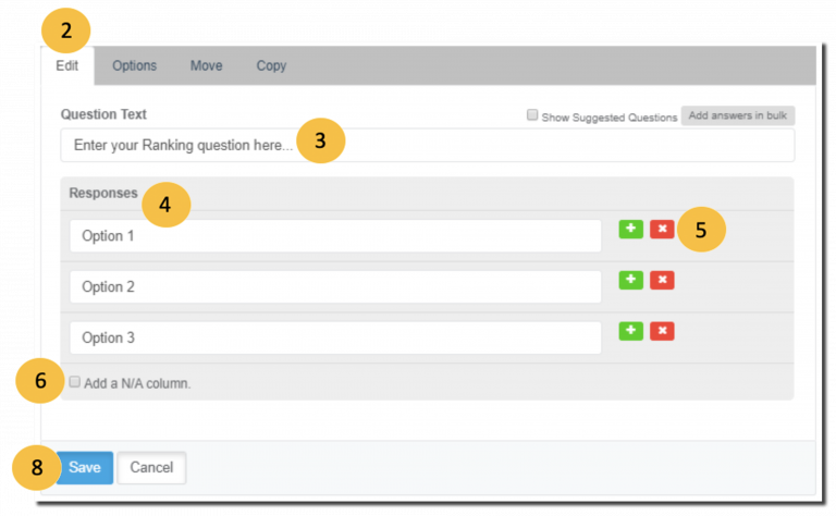 Additional Options and Settings for Ranking question typeUnder the Options, Move and Copy tabs, you can make an additional customization to your survey questions in the following ways: