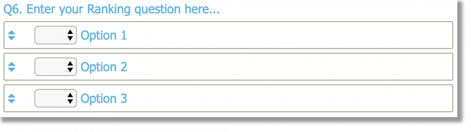 The Ranking question asks respondents to rearrange items by placing them in order of preference. This allows survey respondents to compare different things to each other by placing them in order of how they score (or rank) at a specific detail, such as appearance, value for money, functionality or importance.
